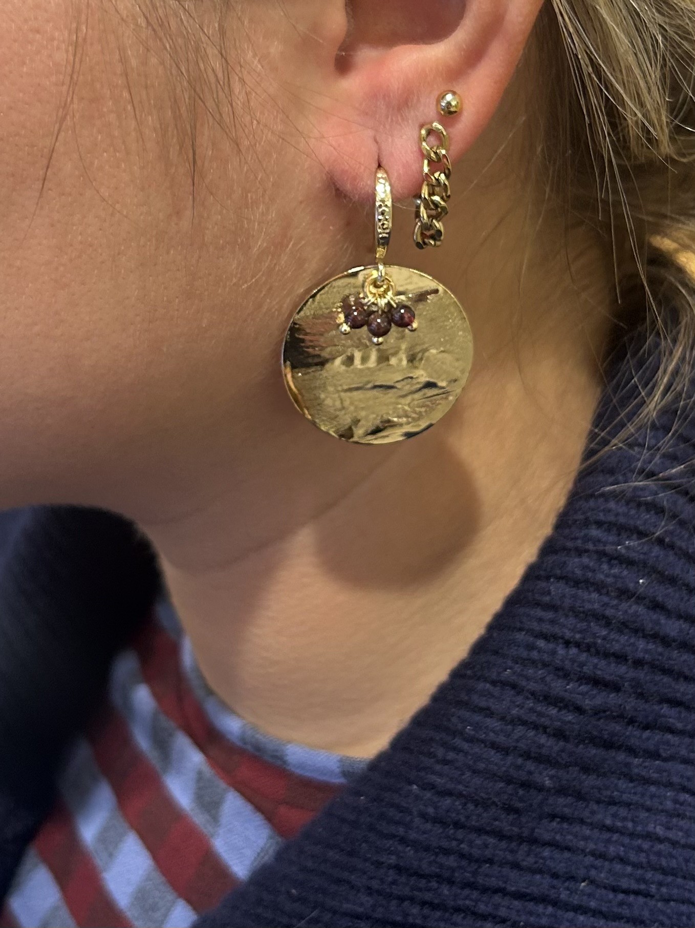 Deze oorbellen uit de Autunno collectie zijn de meest gouden oorbellen, met een prachtige haakhanger met daaraan een gestampt ronden plaatje. Daarop het kleurdetail, een drietal van kleine granaat kraaltjes. Een makkelijke basis oorbel die echt bij alles past.