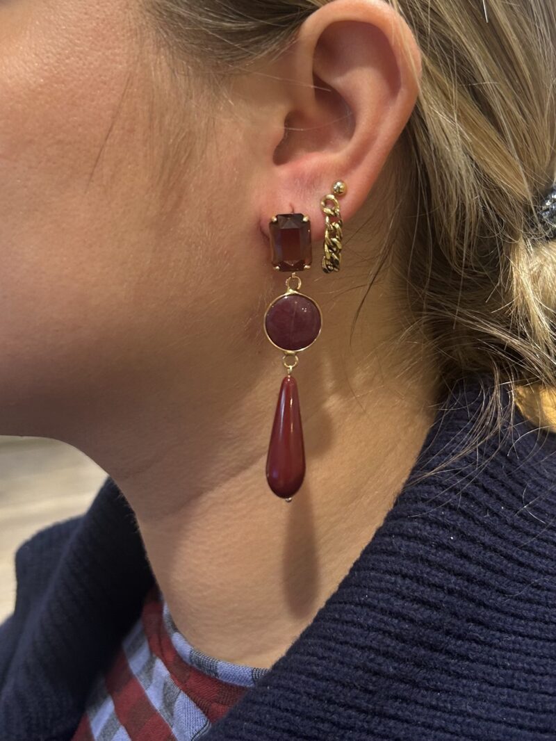 De meest feestelijke oorbellen uit de collectie, meerdere kleuren en materialen maken een mooi geheel. De steker is een prachtige facetgeslepen glasdiamant in een aubergine kleur. Daaronder een prachtige ronde jade steen in het bordeauxrood en helemaal onderaan een resin druppel.