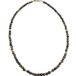 Een prachtige kortere ketting uit de safari collectie. Kan goed gecombineerd worden met veel kleuren en met andere leuke kettingen. De kralen in deze ketting zijn van het halfedelsteen tijgeroog gemaakt, deze heeft mooie betekenissen en werkingen. Zo zegt men dat tijgeroog rust bevorderd, pijnstillend kan werken en helpt bij hyperventilatie. Ook kan de steen een positieve invloed hebben op verkoudheid, astma, ogen, keel, geslachtsorganen en ontkrampen bij spanningen.