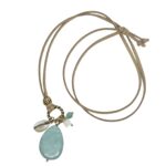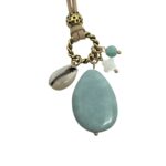 Een sierlijke zandkleurige suede ketting met daaronder een leuk trosje met bedels. Aan het trosje vind je een grote druppel natuursteen in een turquoise kleur, een schelpje, een klaviertje van schelp en een klein amazoniet rondje. Deze ketting is bijvoorbeeld erg leuk bij een witte blouse of off white trui.